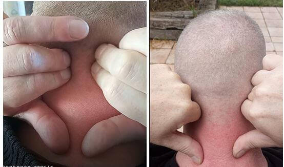 Tu vas positionner tes pouces au-dessus de la bosse sous le cou. Tu ne pourras pas masser avec tes pouces, mais tu peux masser en haut avec tes index et majeurs ».